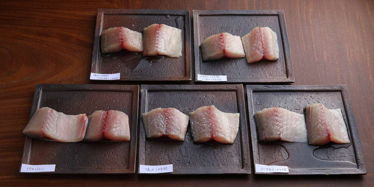 手前左から、①何もしない、②塩〆2時間、③砂糖〆2時間。奥左から④塩〆→砂糖〆各1時間、⑤砂糖〆→塩〆各1時間。鯖は一切れ62g。海の精の焼き塩2g、上白糖9gをそれぞれ付着させた。