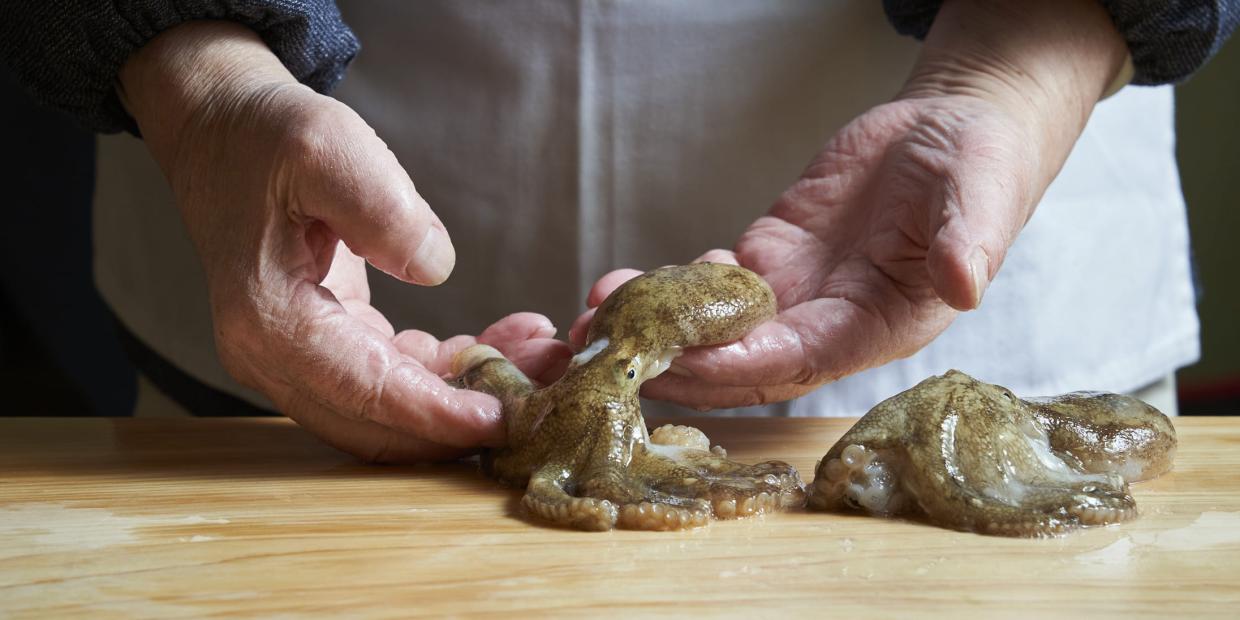 飯ダコは、柔らかさと甘みが魅力ですわなぁ。タコの旨さは皮目と吸盤にありまっしゃろ。ここだけに火を入れて、皮目の旨みと吸盤の食感を際立たせるのが、私流の湯引き造り。火を通し過ぎたら、せっかくの柔らかさが台無しでっせ。
