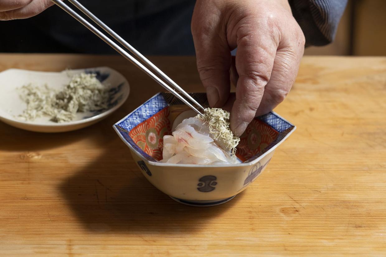 塩梅は、煮切り酒に昆布を漬けて、煮切りみりん、淡口醤油、米酢と合わせた淡口合わせ酢でいきまひょ。鱚を器に盛り、ここにまぶして、白髪昆布とワサビ。桜の季節でっさかいネ、独活の花びらを散らして仕上げました。
