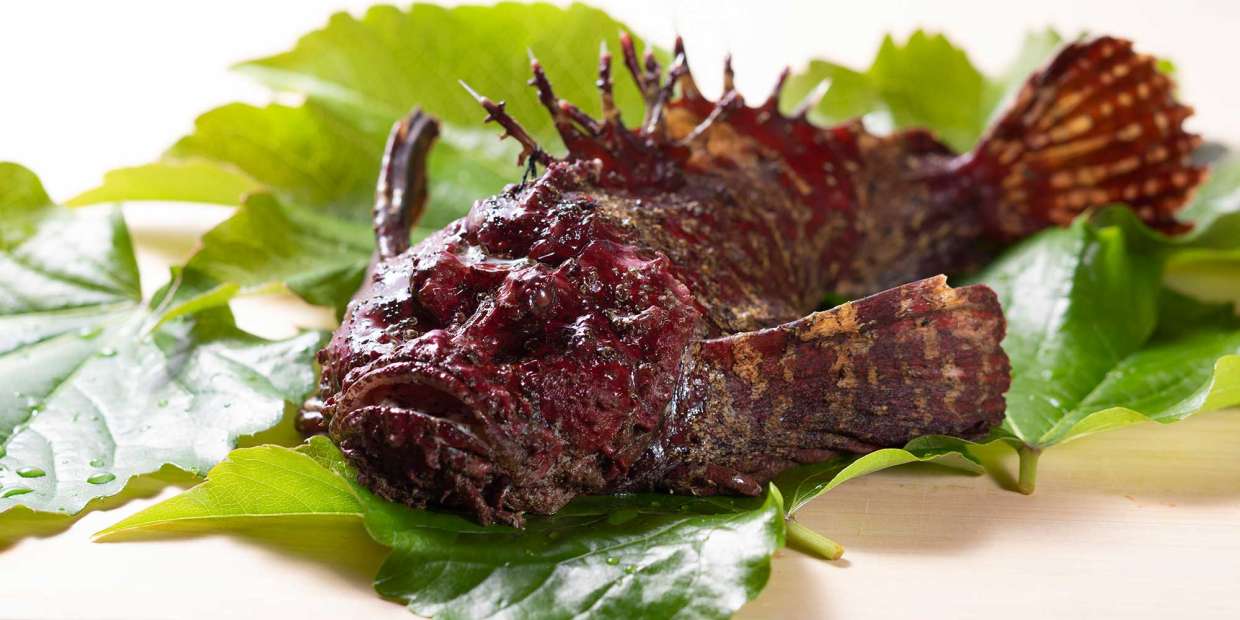 怪異な見た目の魚ほど美味しいとよく言われますが、オコゼはその代表格。ヌルヌルとした皮一枚の下から、真珠色に輝く白身が現れます。その身の上品な味わいが上野修三さんはお好きだそうで、「お造りか煮物がよろしいな」と話します。オコゼは年中揚がりますが、初夏には子を持ち、身の味わいは淡泊になりがち。「そんな今の時季は、一尾丸ごと味わえるように工夫すべき」と上野さん。自身の割烹で人気を博したと言う2品の仕事をご紹介します。