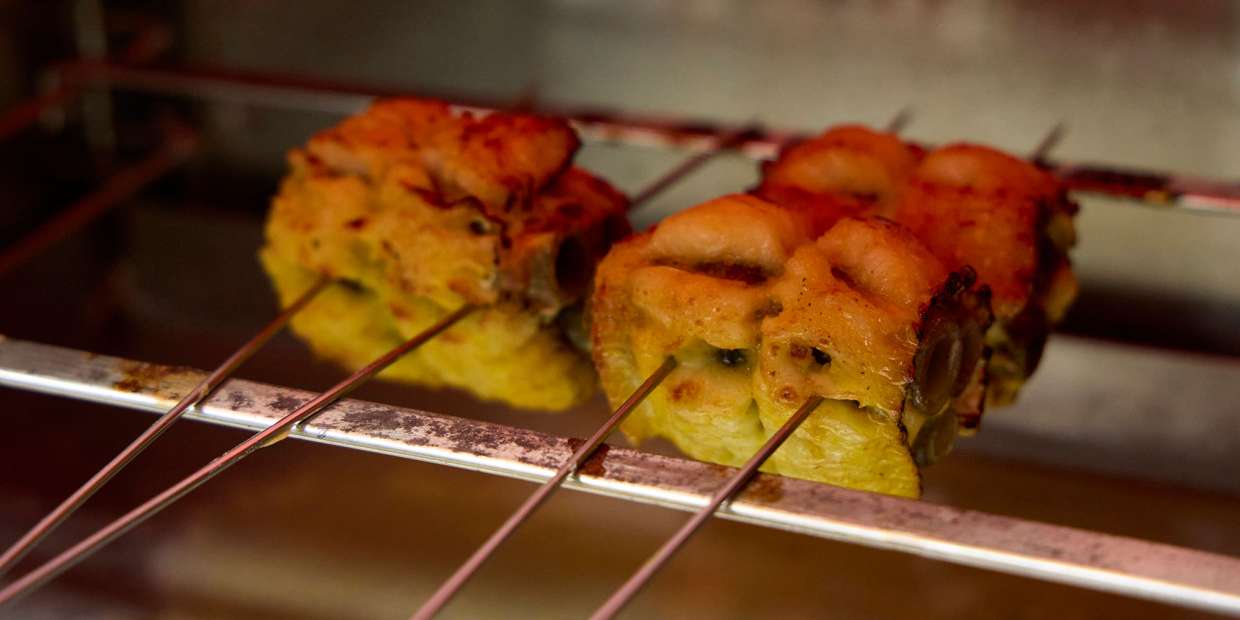 - 「鱧だし淡口醤油ダレ」に卵黄と一味唐辛子を加えて⑨に塗り、サラマンダーで焼く。途中、金串を打ち直し、先のタレを再び塗って、まんべんなく全体に焼き色を付ける。