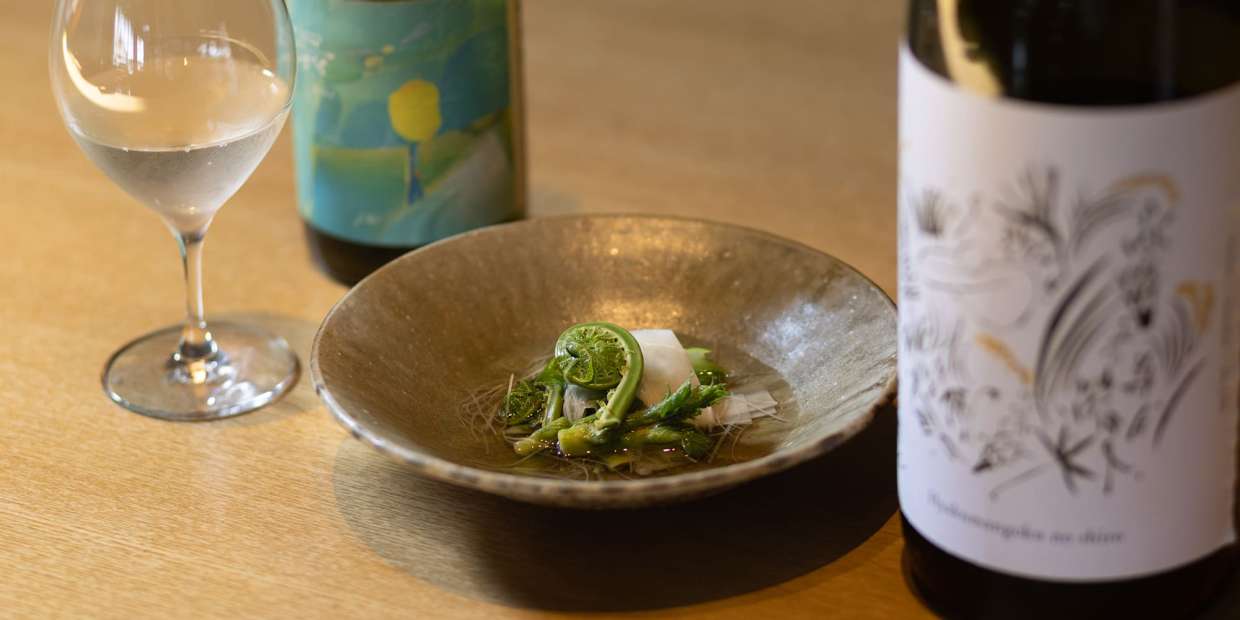大地の生命力を感じる緑の香り、甘み、ほろ苦さ。シャキシャキ、コリコリ、ねっとりした食感。味わいも歯応えも違う数種の山菜が、多重奏を奏でるように一皿の中に集い、爽やかな新ショウガの風味をまとった浸し地が、指揮者のごとく一つにまとめ上げる。浸し地はカツオ昆布だしに、石川・能登のいしり(魚醤)と珠洲(すず)の塩を隠し味程度に加えた淡味仕立てだ。