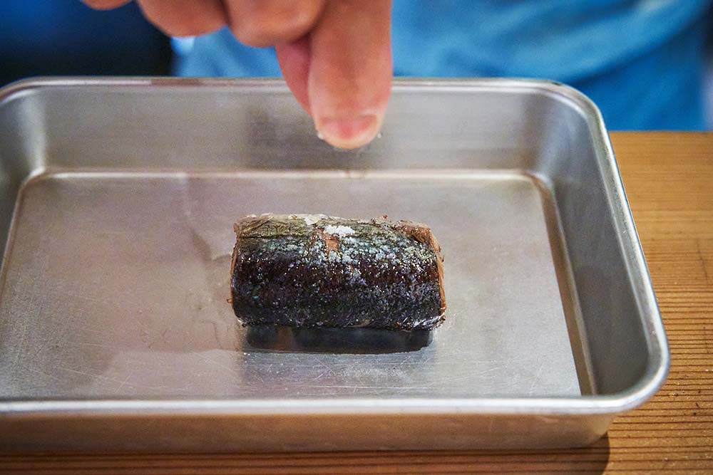 一般的にはサンマに塩をしてからオイル煮にするが、中田さんは提供直前に塩を振るという。「オイル煮は煮物と違って、調味料の浸透が予測しにくいんです。塩辛くなったら戻せないし。最後に振った方がバチッと味が決まると思います」。なるほど理に適っている。