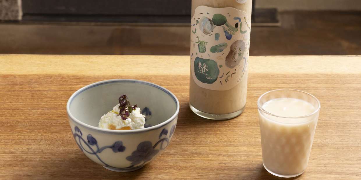 レモンが爽やかに香る自家製リコッタチーズと柿のゴマ酢和えが絶妙なコンビネーション。チーズの副産物・ホエイ(乳清)も活用して重層的な味に仕上げます。大阪・本町『日本酒餐昧 うつつよ』の藤井章弘さんらしい和洋折衷な酒肴は、優しい甘みのどぶろくとの相性も抜群です。