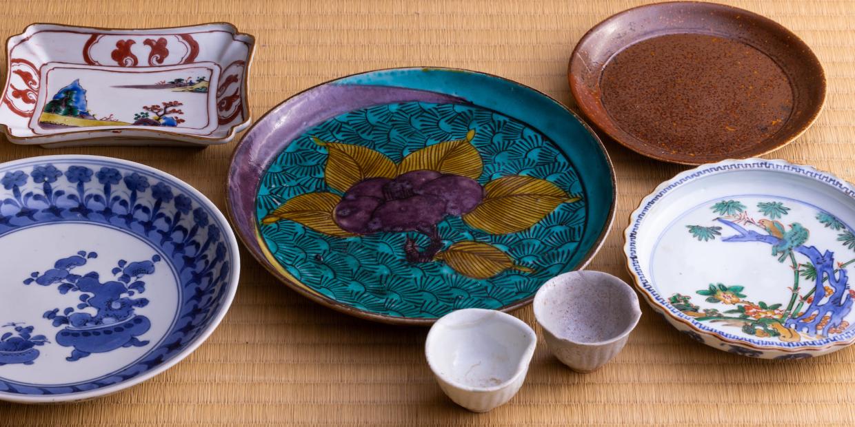 白い磁器に派手やかな色彩の絵が描かれたうつわ。伊万里焼といえば、そんなイメージでしょうか。実は、写真上のうつわはすべて、明治時代以前に伊万里で焼かれたもの。染付あり、色絵あり、素朴な盃(さかずき)風ありと様々です。そんな知られざる伊万里の歴史にスポットを当てた今回の十問十答。今回からは前編・後編と、5問ずつに分けて配信。前編では『菊乃井』村田知晴さんが、『梶古美術』で伊万里の原点を学びます。