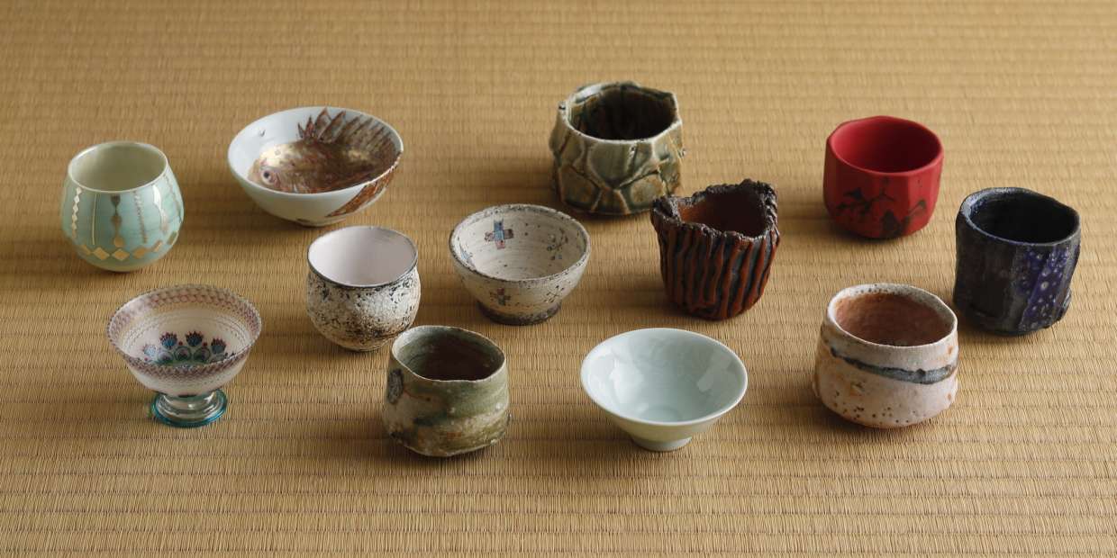 酒杯をテーマにお届けする今回の十問十答。後編は、『梶 古美術』梶 高明さんの奥様が開催した「百趣百盃(ひゃくしゅひゃくはい)」で展示された現代陶の数々をご紹介します。土ものあり、磁器あり、ガラス製あり。形も、大きさも、色使いも様々。その自由さが酒杯の面白さではありますが、はて、盃(さかずき)やぐい呑(のみ)のどこを見るべきか? どこに注目して選んだらよいのか? 梶さんの持論を展開していただきます。