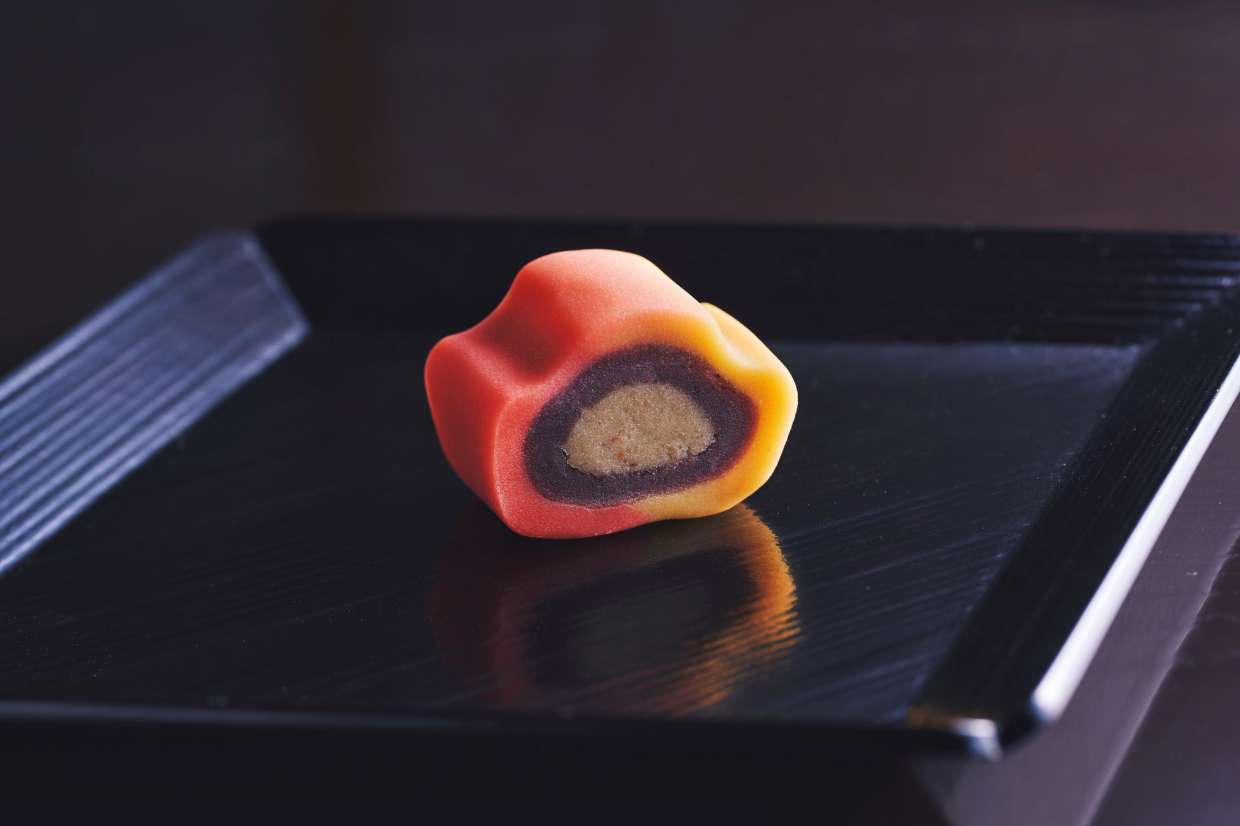 山中に続く細い道を意味する「山路」は一般的には“やまじ”と読むが、京都の和菓子界では“やまみち”と読ませる店も少なくない。うっそうと葉が茂る野山の風景を指すため、ひと口に山路と言っても新緑の頃を表現した緑色もある。とは言え、多くの人が思い描くのは紅葉を表現した赤や黄色の「山路」だ。