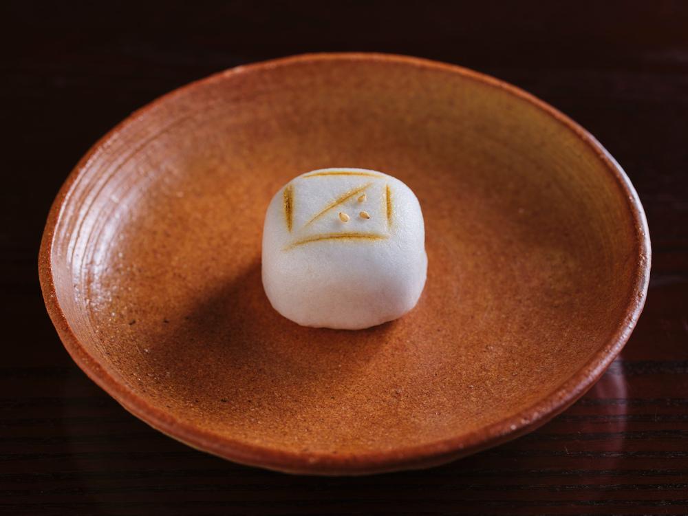 そんな大切なアイテムである炒り豆を盛る、“益々福が来ますように”との願いを掛けて“福枡”と呼ばれる容器をモチーフにした薯蕷(じょうよう)饅頭はこしあん入り。手仕事の温かみが出るように、コテで1線ずつ焼きつけた〼(枡:ます)の字に合わせてゆるやかな四角に成形。豆をイメージした白ゴマを3粒、座りが良い右下の位置に貼り付けている。