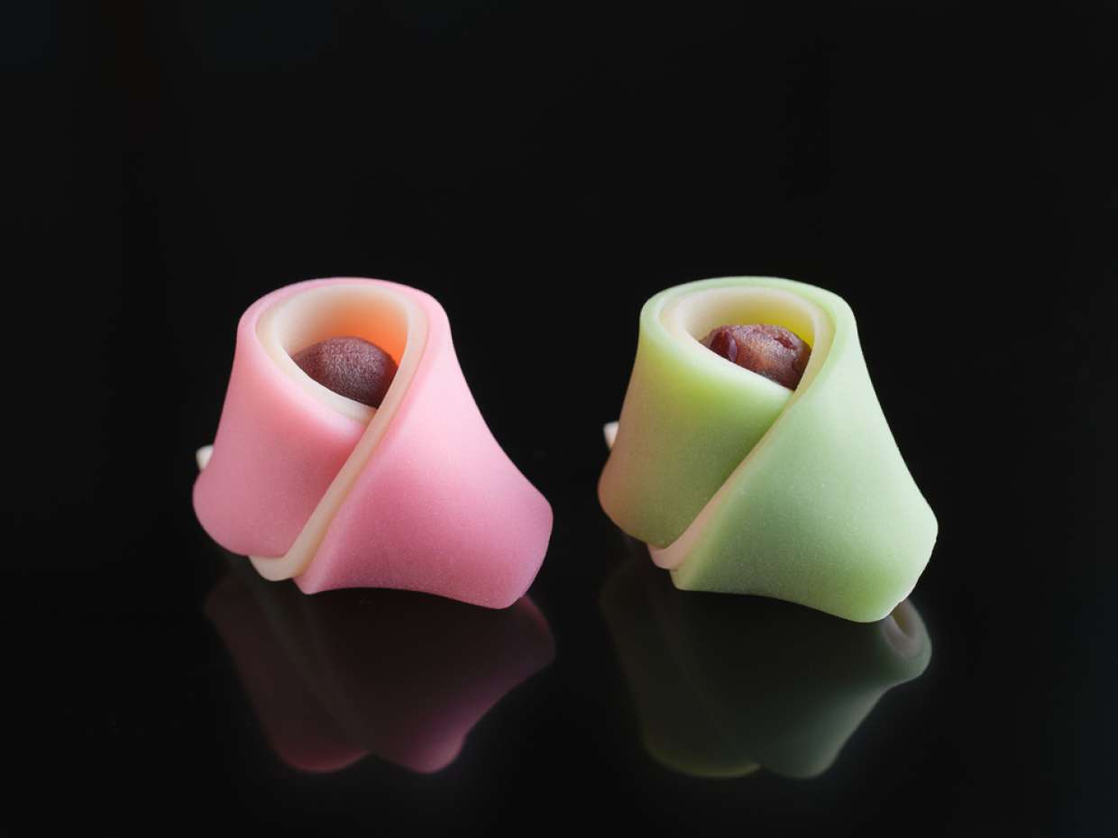 色の違う2枚のこなし生地を着物のように重ね、女雛はこしあん、男雛は粒あんで作る小ぶりのあん玉を包む“お雛さん”は人形そのもの。食べてしまうのが躊躇(ためら)われる愛らしさだ。こなし生地は少し長めに作り、“お引きずり”スタイルにして動きを出した。