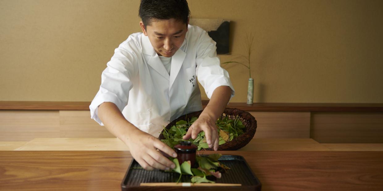 10月初旬のこととて、まだ色づく前の銀杏(いちょう)の葉がわんさと入った箕(みの)を手に、店主の北嶋靖憲さんがカウンターに立つ。その葉を両手で抱えて、お敷の上へ。すると中から、小さな椀が出てきた。