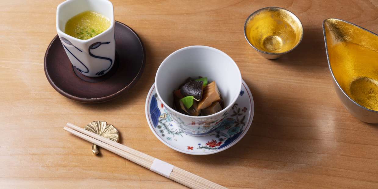 器は、明治創業の和菓子店『石村萬盛堂』の待ち合いで供される鶴乃子湯呑みを使用。「飲食店には卸していないと言われたのですが、『博多料理を県内外に発信するコースの、最初の器として使いたい』と懇願しまして」。通常の湯呑みより少し小ぶりで、上品な印象。夏の暑い日は冷たいお浸しの後、優しい味わいの吉野煮を提供する際はその後など、2品目に提供することも。