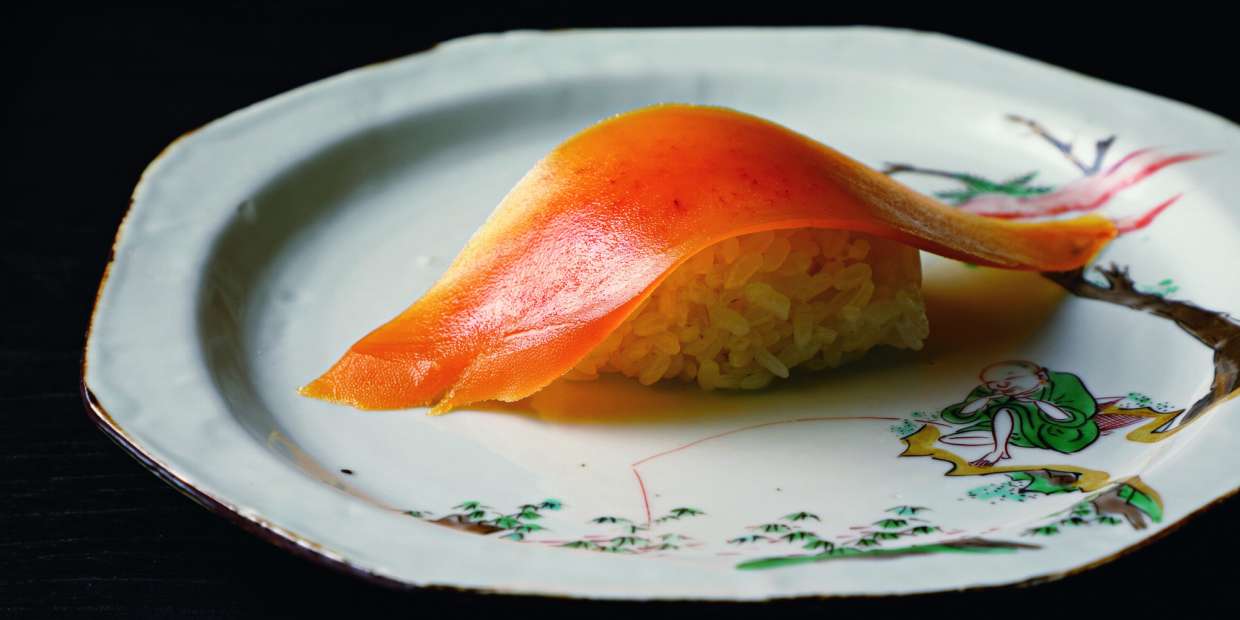 鴨川畔の閑静な地に、数寄屋造りの館を誂えた。石造りのアプローチやせせらぎのある日本庭園も含め、敷地は100坪。ゆったりした檜のカウンターは、わずか10席だ。カウンターの奥には、杉本博司氏の筆による「獨歩」の軸が掛かっている。