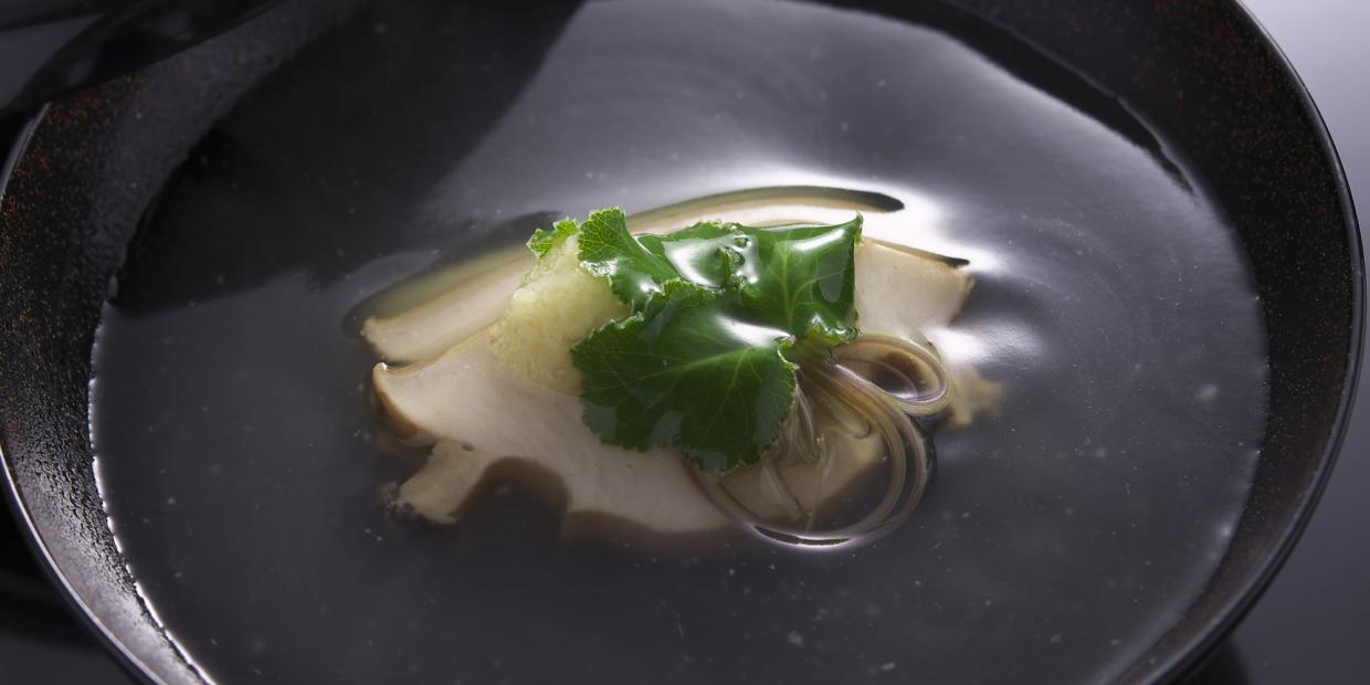 一番だしにアワビの煮汁を加えてコクと深みを増し、アワビ柔らか煮の風味をより一層引き立てるために生姜を添えたお椀です。