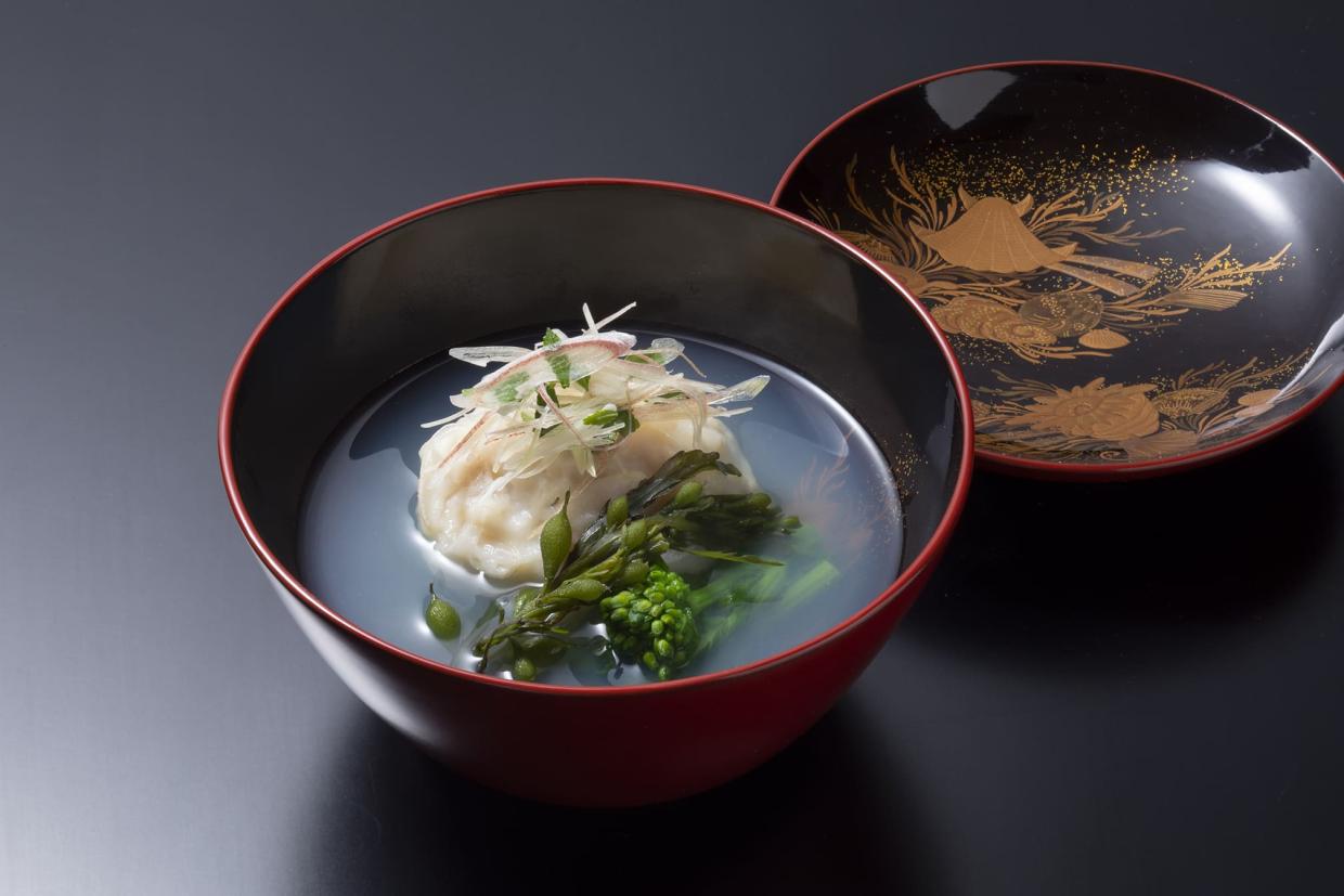 ⑨ ⑦は⑧の吸地少量をかけて椀に盛る。吸地八方に漬けたまま火にかけて温めた神馬草と菜の花を添える。熱い⑧の吸地をはり、花ミョウガと木の芽をのせる。