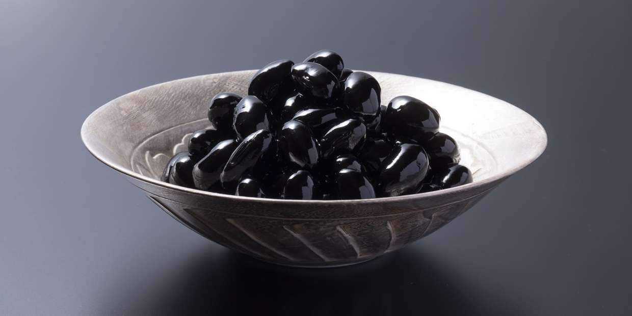 黒豆蜜煮は、邪気を払うような黒色、皺(しわ)が寄っていない皮、ふっくら柔らかい食感がポイントです。