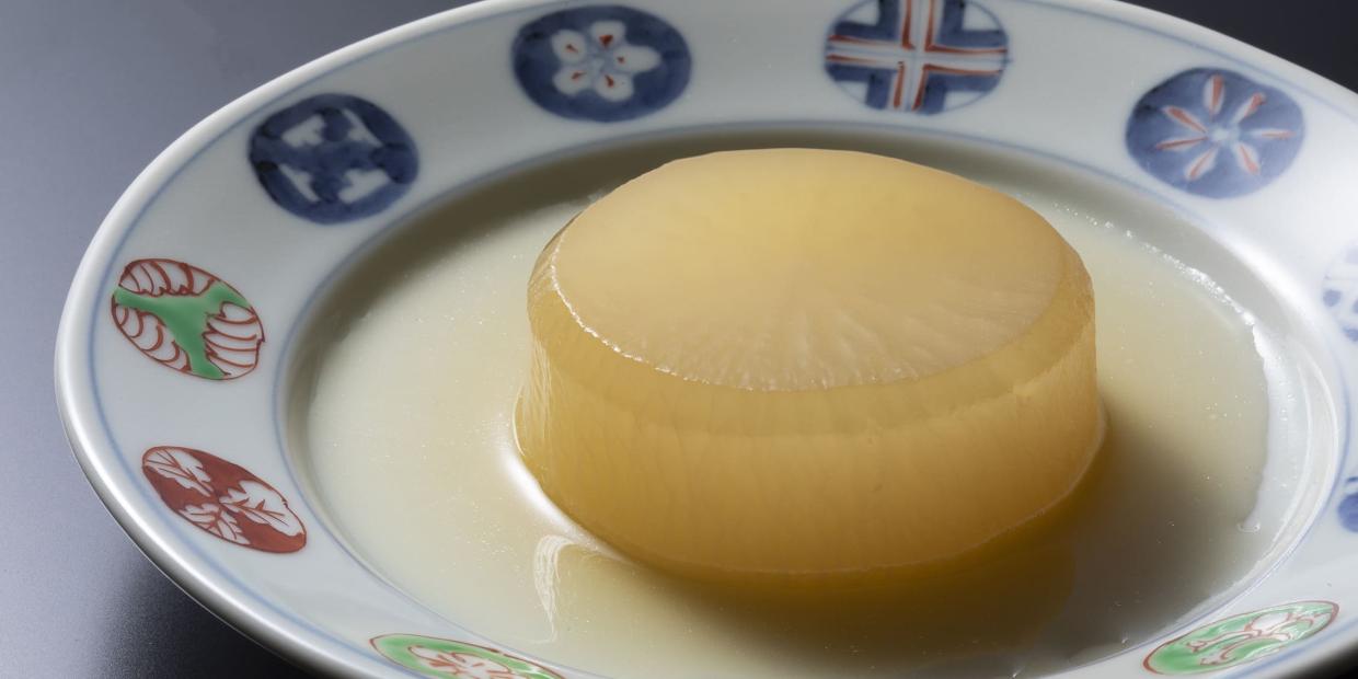 まず、米のとぎ汁で茹で、煮やせしにくくすると共に大根の白さを際立たせます。そしてしばらく水にさらすことで臭みを抜くことができます。