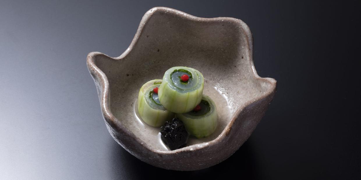 砧巻きは、日本料理のコースの中でも前菜や八寸の一品、酢の物など、いろんな献立で登場する料理です。巻くもののバリエーションも豊富で、春なら薄焼き玉子で巻いたり、秋冬ならカブや大根でスモークサーモンを巻いたり。夏ならアジをキュウリで巻くのも定番ですね。