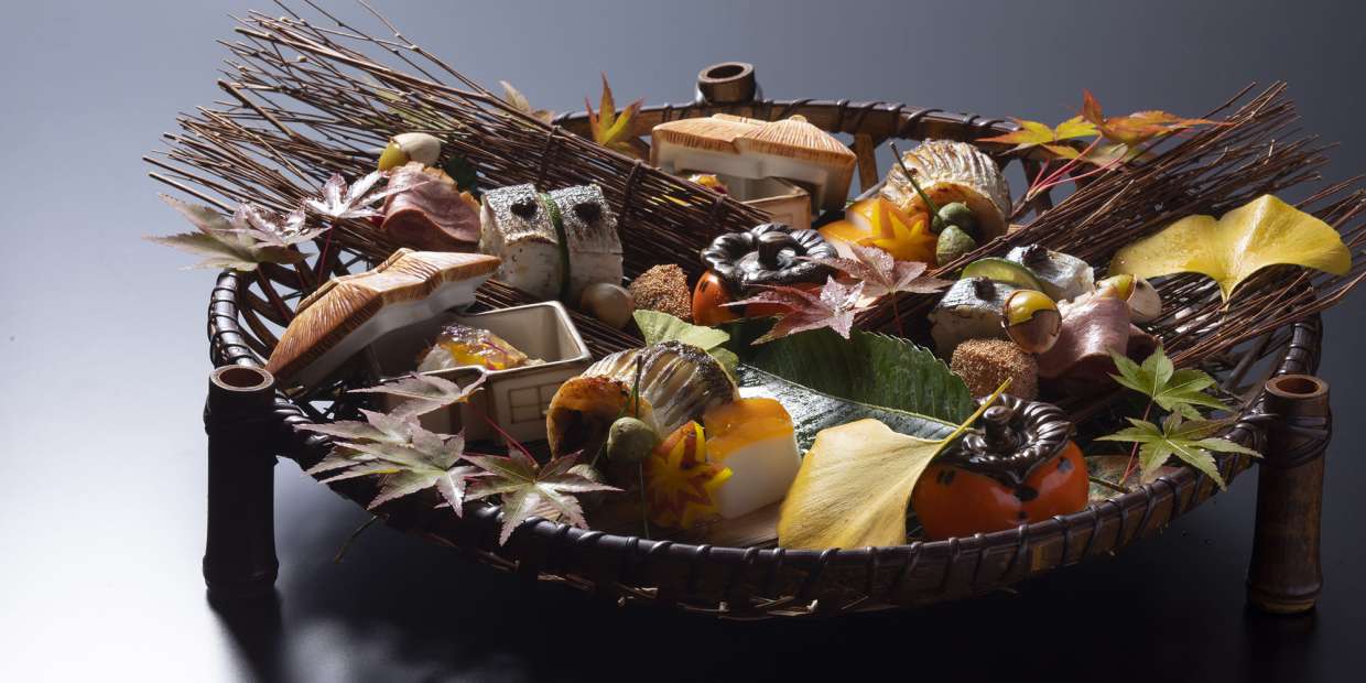 風に吹き寄せられ、紅葉や木の実が庭の一角に集まったかのような、秋の風情。「辻󠄀調理師専門学校」岡本健二先生が仕立てた「吹き寄せ」は、料理の色合いや形、かいしきの取合せにより、季節の移ろいの中に感じる哀愁や“枯れ”の美意識も感じさせます。今回、盛り込んだ料理は10品。3回に分けて、レシピを公開します。
