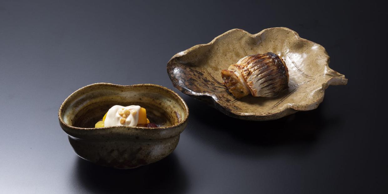 「辻󠄀調理師専門学校」岡本健二先生が仕立てる「吹き寄せ」レシピVol.3は、盛り込みスタイルの中でも存在感を放つ「カマス俵焼き」と、爽やかな風味の「秋の果実 白地がけ」です。丸めたカマスに詰めた「キノコ味噌」やクリームチーズを多めに加えた白地は、他の食材とも合わせやすい、知っておくと重宝するレシピです。