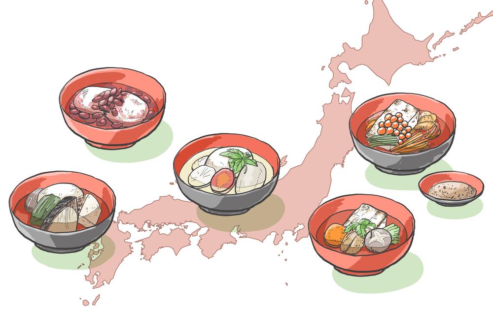 餅については東日本では焼いた角餅、西日本では煮た丸餅と言われます。汁の味つけは、すまし仕立てが関東(中国、四国の一部、九州)、味噌󠄀仕立てが関西と北陸・四国の一部、変わり種はあずき汁の鳥取・島根など。具は、野菜類ではニンジン、大根、里芋、カブ、ネギ、ゴボウ、青菜などが全国的に使われ、肉は、鶏肉や鴨肉など鳥肉類が主で、牛豚はほぼ見られません。魚介類は年取り魚(東の鮭、西のブリ)、ハマグリ、エビ、牡蛎、イクラなど地域性が強いです。その他には焼き豆腐や凍り豆腐、練り物、昆布など。