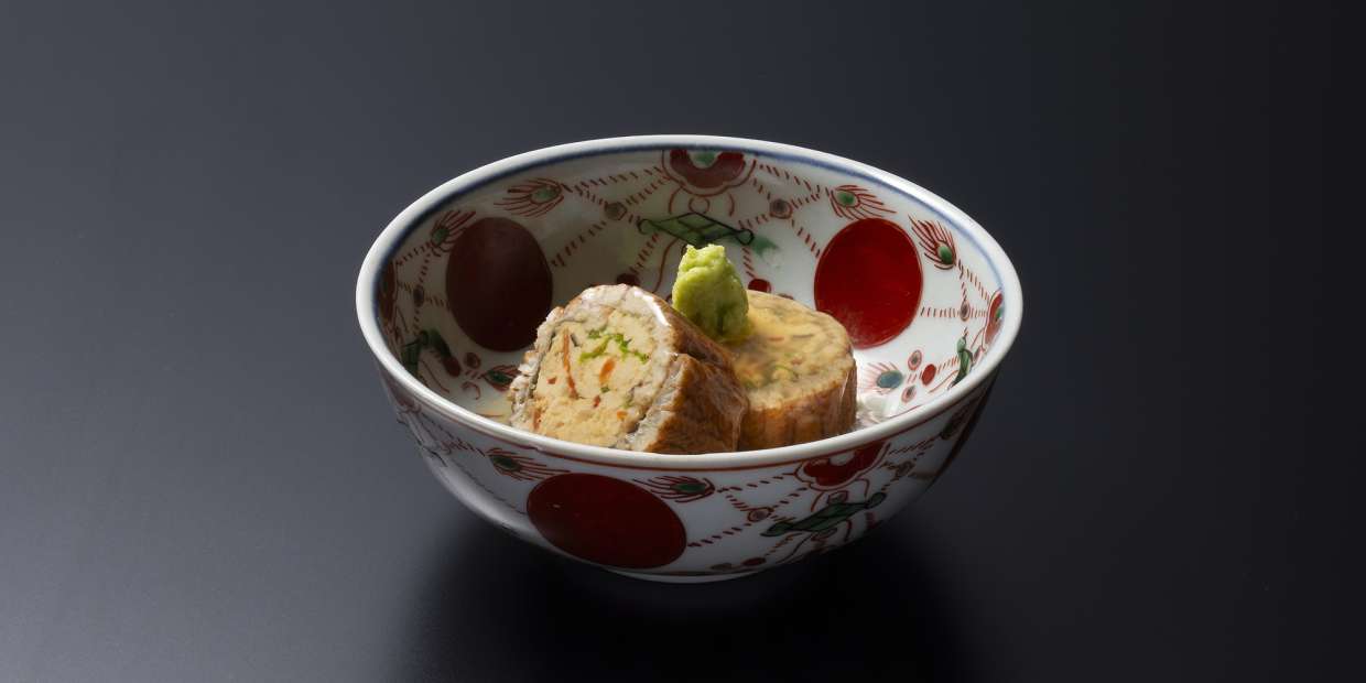 煮穴子で巻いて蒸し、銀あんをかけたら完成。ツヤッとした照りが食欲をそそりますし、すりおろしたワサビを溶き絡めながら食べると味わいのアクセントになります。