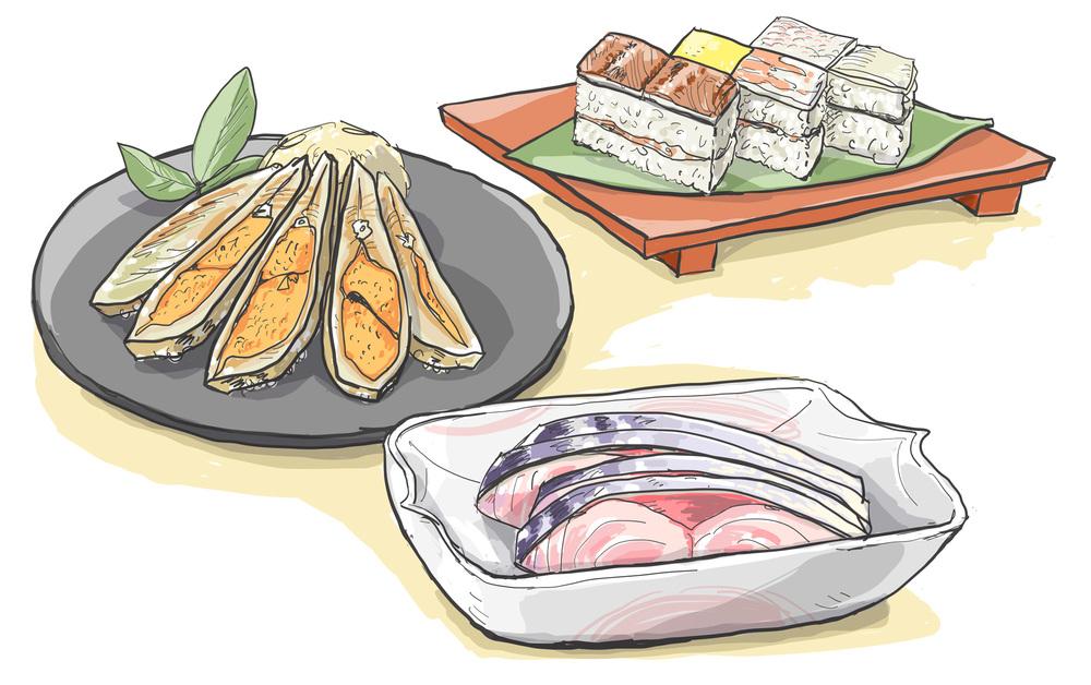 現在「生ずし」といえば、関西においては鯖・鰆・鰺などに塩をあて、酢で締めた酢の物を指します。鯖の生ずしは、一般的には「しめ鯖」と呼ばれるもので、酢飯は使いません。先の、塩締めか酢締めにしたまながつおを生ずしと呼ぶ流れをくむのでしょうが、関西の生ずしについて描写されたものを調べると、いろんな記述や説に行き当たります。