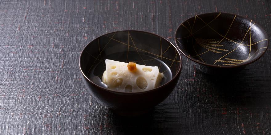 暑さが本格的になる季節には深みのあるだしに、シジミ、トマト、赤万願寺唐辛子を加えて、脂身が美味しい沖縄の「あぐー豚」をしゃぶしゃぶに。スープの中に焼きトマトのエキスが溶け出し、柔らかな酸味が心地よい夏らしい爽やかな鍋に仕立てている。
