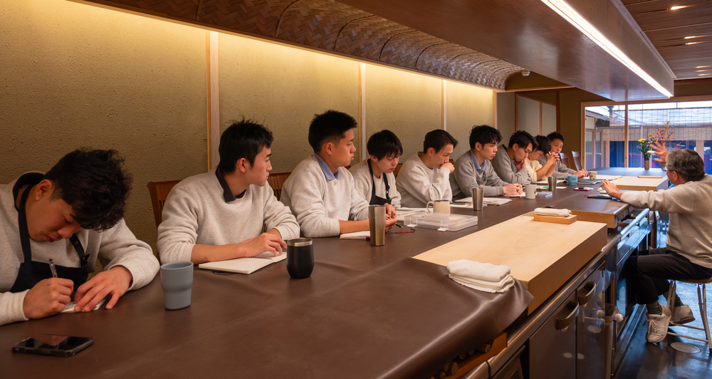 『衹園さゝ木』の献立会議:2023年、リニューアルを経てコンセプトを「師弟で挑む味づくり」に。調理スタッフと共にアイデアを出し合い、若い感性と佐々木さんの経験値を掛け合わせ、献立を組み立てる。夜のコースは基本的に、先付、前菜、椀、向付2品、鮨2カン、焼き物、進肴(すすめざかな)、鉢物、ご飯物、デザート。昼のコースは夜のメニューを取り入れつつ、料理6品、ご飯、デザートで構成する。献立会議を経た後、すべての料理を試作し、改めて試食会でサービススタッフや姉妹店『衹園 楽味』のスタッフが試食、最終チェック。料理内容は、その都度、修正・改良が加えられる。